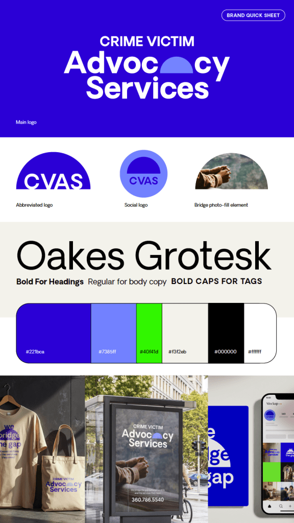 “Crime Victim Advocacy Network of Thurston County Region 11” – now that’s a mouthful. CVAN needed a rebrand – not only was the name a cascade of loaded words, but it was no longer accurate. This was causing confusion with partners and with the people CVAN served. After meeting with the team, we held a naming brainstorm session and landed on the more concise “Crime Victim Advocacy Services” with the tagline “Thurston County” when necessary.