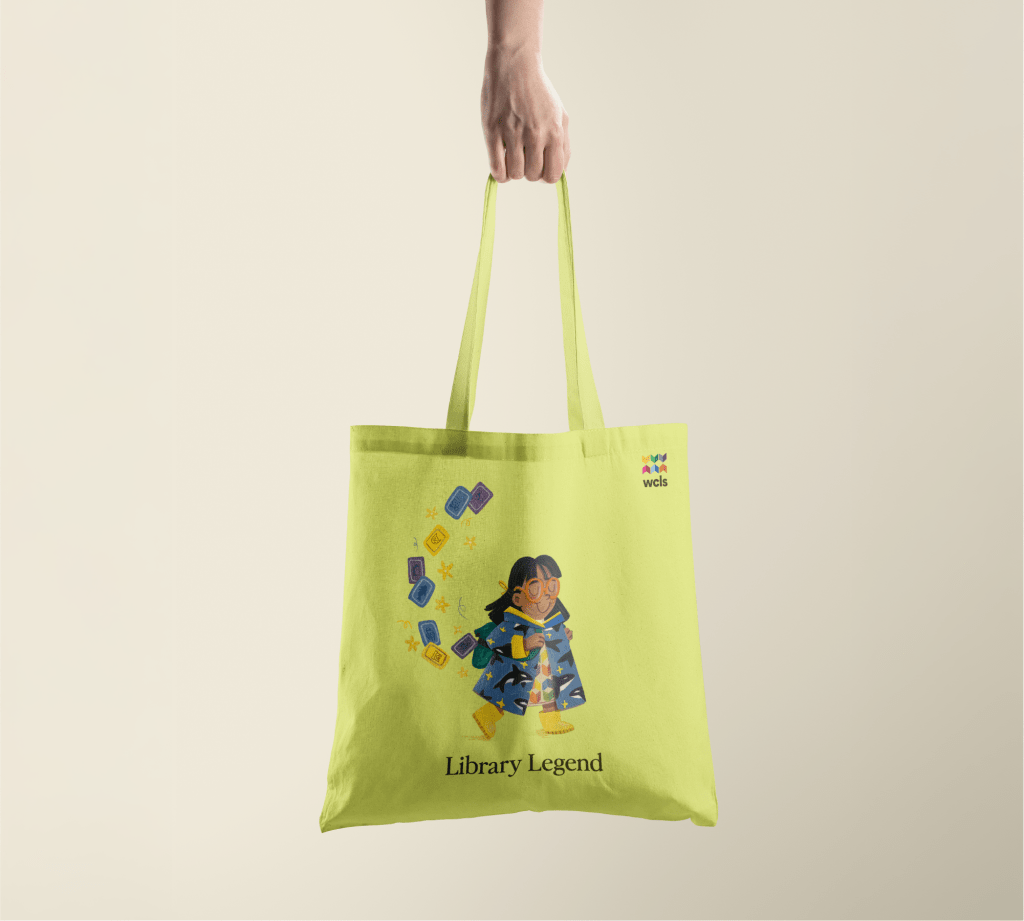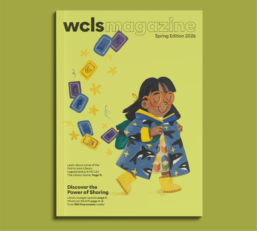 As an illustrator, though, there’s an opportunity to go further—by creating a local library mascot that represents our people and place in a playful, welcoming way. Enter: Aiyana, the orca-raincoat-wearing little bookworm. Redesigning the WCLS magazine was a great way to bring her on to the scene but she’d fit well anywhere: on a library card, a tote bag, or aiding in library way-finding.