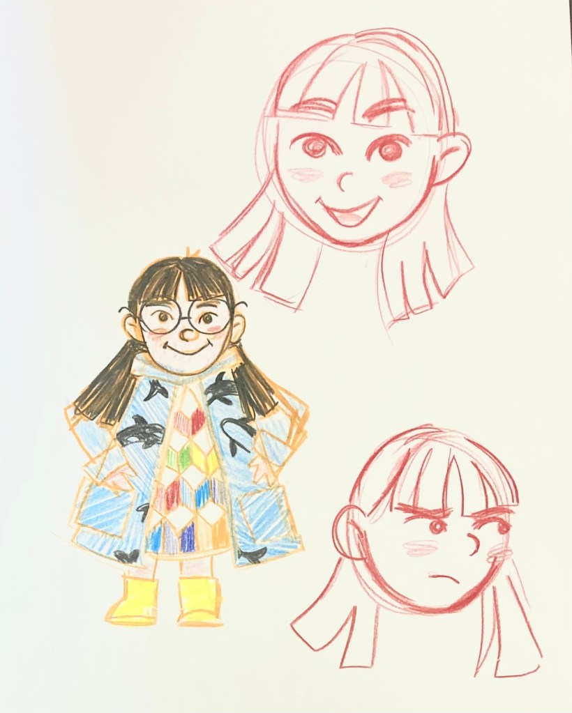 As always, I started with rough sketches. I had some clear goals in mind for this character: a young, Native American girl with clothing that matched the library branding as well as the rainy PNW vibes. Our PNW waters are home to orca whales, so I created a raincoat patterned with these mighty and beautiful sea creatures. The final illustration I hand painted with gouache and colored pencils, adding minor touchups in Procreate and Photoshop.